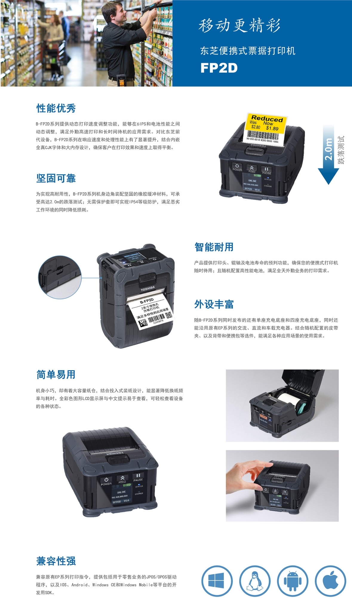 東芝致力于便攜式打印機(jī)領(lǐng)域的創(chuàng)新技術(shù)與應(yīng)用開(kāi)發(fā);B-FP2D系列專(zhuān)為用戶(hù)體驗(yàn)而設(shè)計(jì),堅(jiān)固緊湊的機(jī)體結(jié)構(gòu),輕巧、易于操作;擁有2英寸便攜機(jī)的打印速度和電池性能,滿(mǎn)足多樣性的應(yīng)用場(chǎng)景。