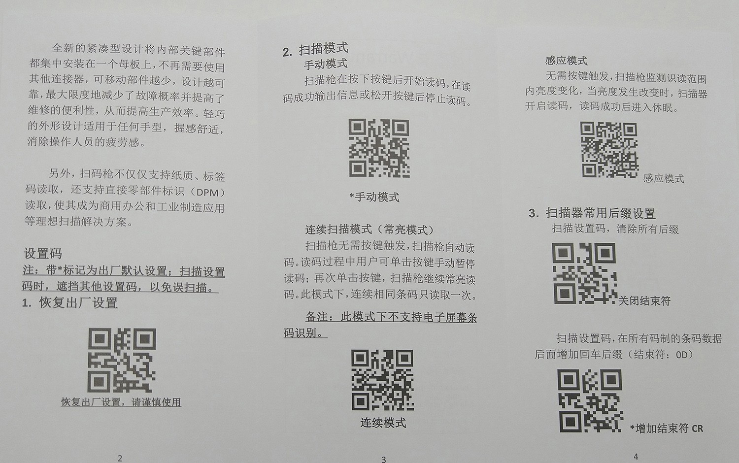 1 .恢復(fù)出廠設(shè)置連續(xù)掃描模式(常亮模式)掃描槍無(wú)需按鍵觸發(fā),掃描槍自動(dòng)讀碼。讀碼過(guò)程中用戶(hù)可單擊按鍵手動(dòng)暫停讀碼;再次單擊按鍵,掃描槍繼續(xù)常亮讀碼。此模式下,連續(xù)相同條碼只讀取一次。關(guān)閉結(jié)束符備拉廷衛(wèi)比摸式王王直盆生區(qū)通崖盜碼識(shí)別。掃描設(shè)置碼,在所有碼制的條碼數(shù)據(jù)后面增加回車(chē)后綴